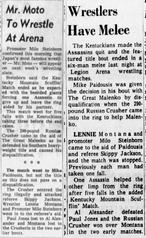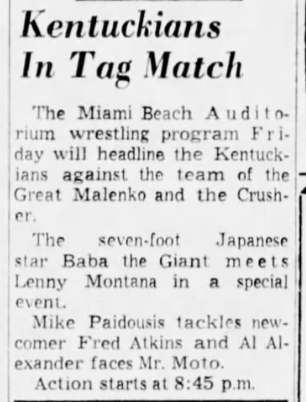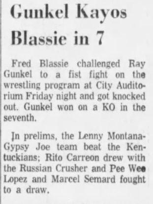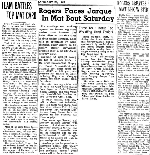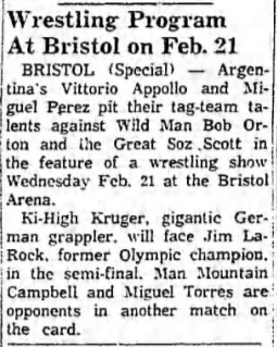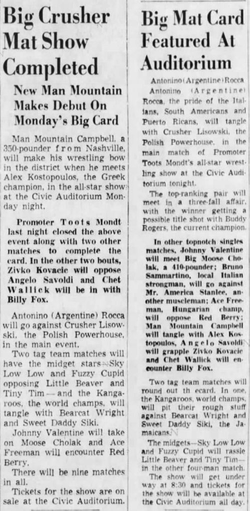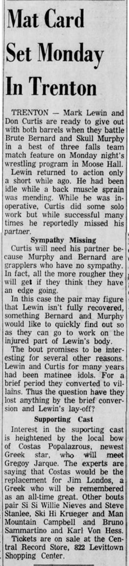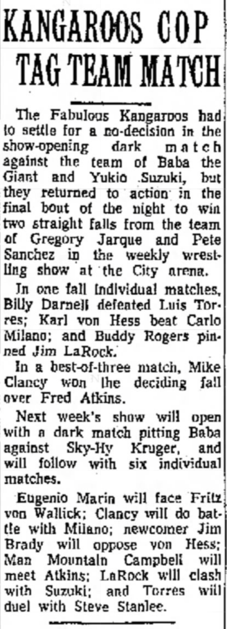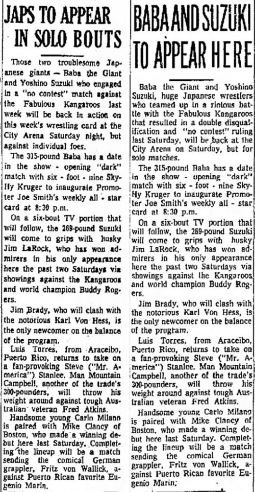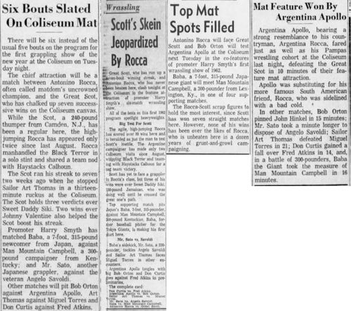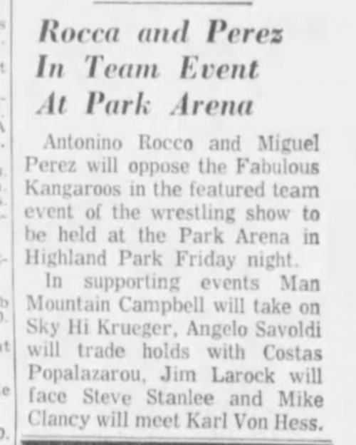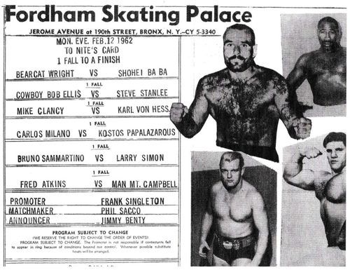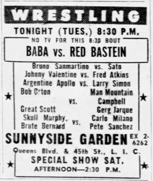 “Promoter Jean Pellettieri yesterday signed Bruno Sammartino to meet Karl von Hess, Sky Hi Krueger to battle Man Mountain Campbell and Costoas Poplazaro to face Gregory Jarque to complete the program which will show Si Si Willie Nieves against Steve Stanlee.”