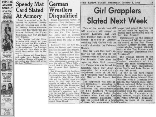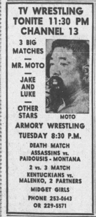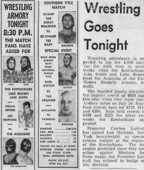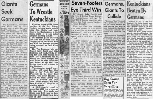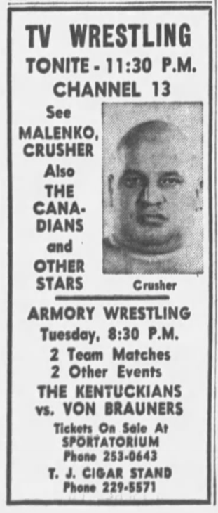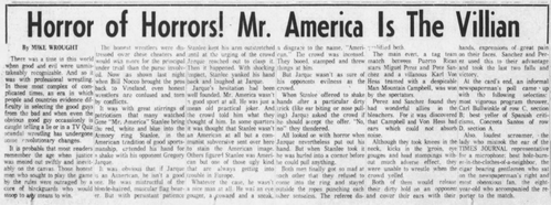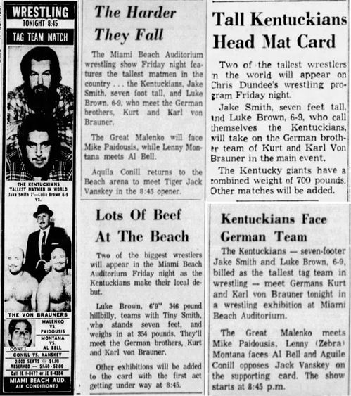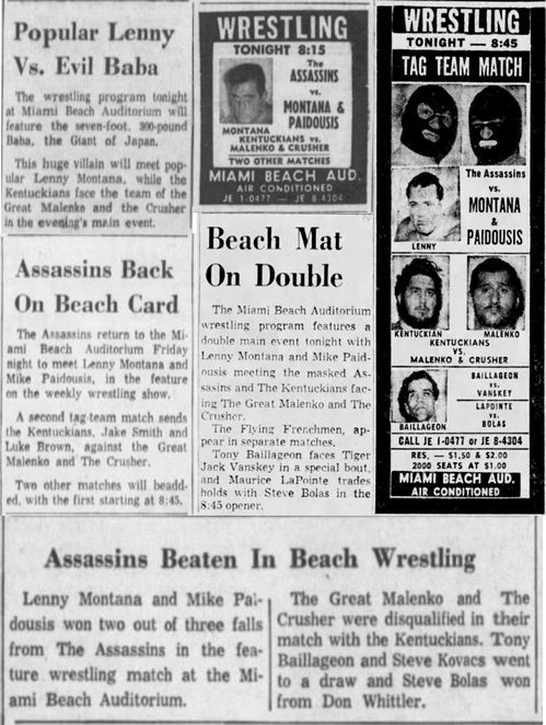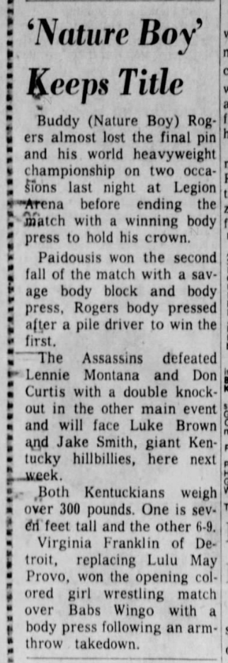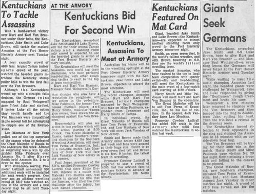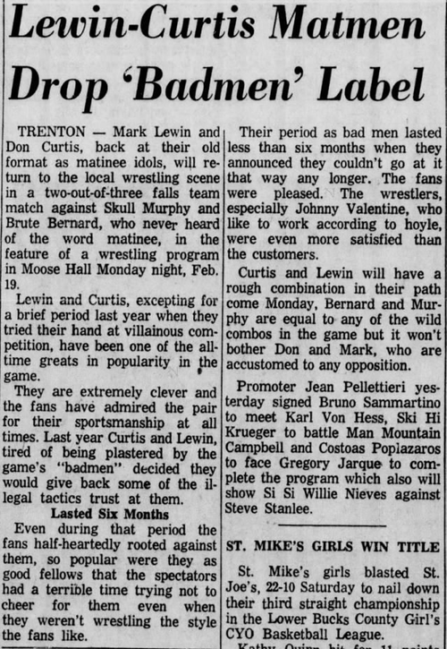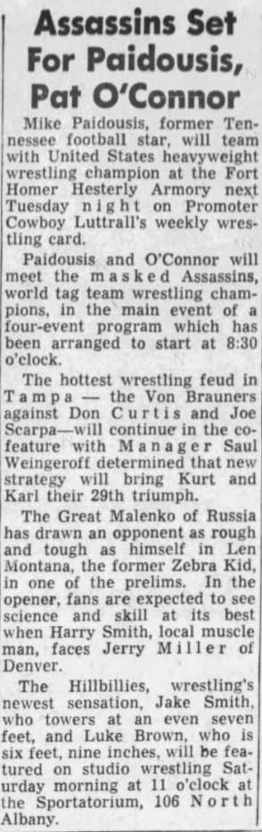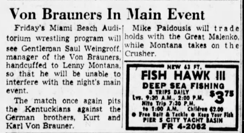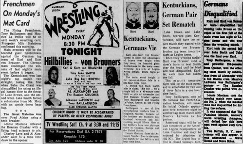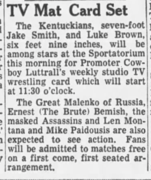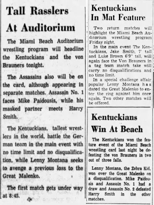 “Promoter Jean Pellettieri yesterday signed Bruno Sammartino to meet Karl von Hess, Sky Hi Krueger to battle Man Mountain Campbell and Costoas Poplazaro to face Gregory Jarque to complete the program which will show Si Si Willie Nieves against Steve Stanlee.”