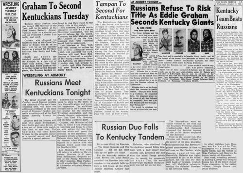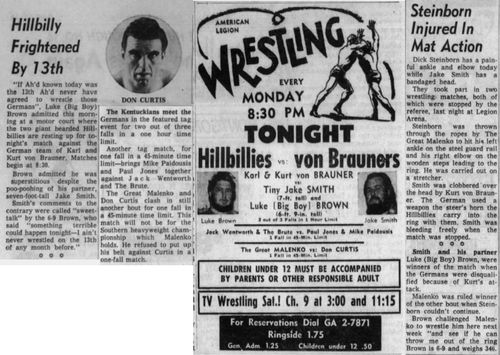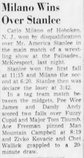 Pittsburgh – Steve Novak, back in his hometown after a long absence, easily defeated Man Mountain Campbell with a cobra twist. (see above Jan 8, 1962)