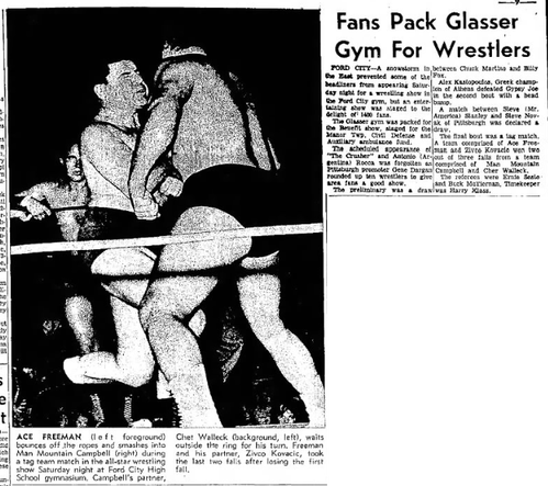 ACE FREEMAN (left foreground) bounces off the ropes and smashes into Man Mountain Campbell (right) during a tag team match in the all-star wrestling show Saturday night at Ford City High School gymnasium. Campbell’s partner, Chet Walleck (background, left) waits outside the ring for his turn. Freeman and his partner, Zivco Kovacic, took the last two falls after losing the first fall.