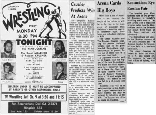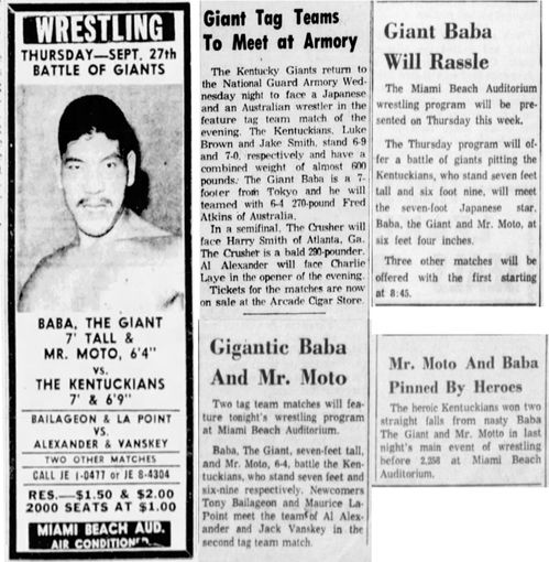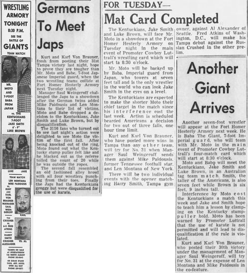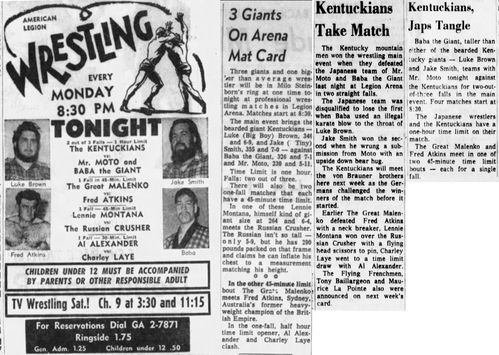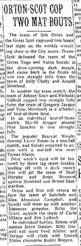 Orton and Scott will return to face the team of Sanchez and Man Mountain Campbell, and Suzuki will team up with another Japanese grappler, Baba the Giant, against the team of Carlo Milano and Jim LaRock.