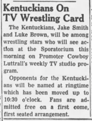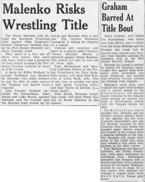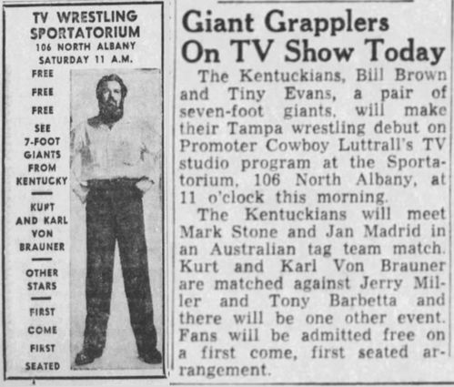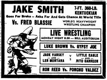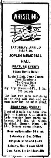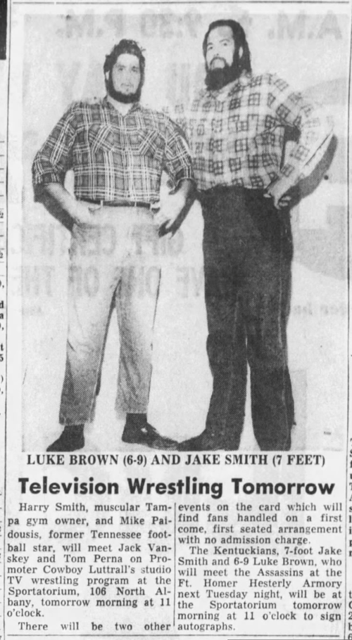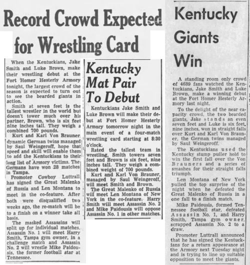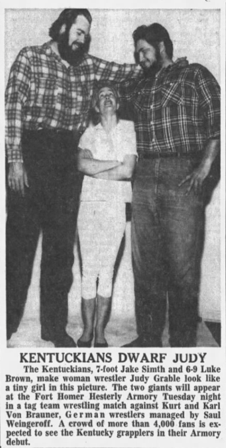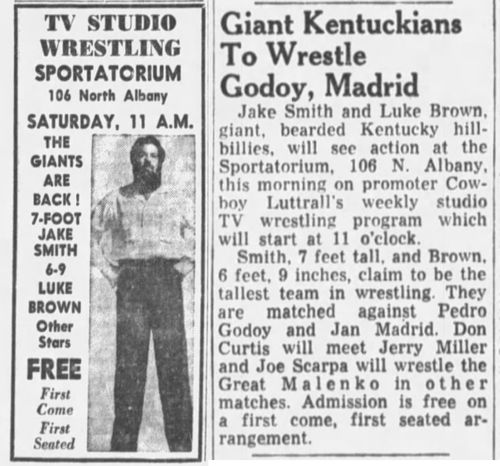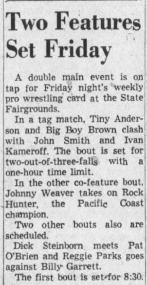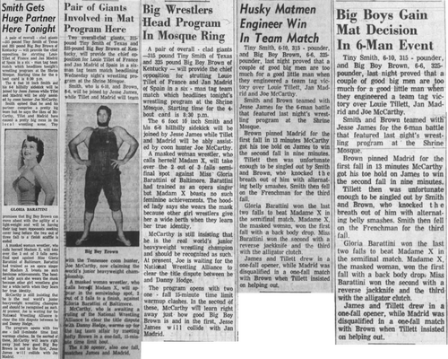 A pair of overall – clad giants – 315 pound Tiny Smith of Texas and 325 pound Big Boy Brown of Kentucky – will provide chief opposition for strutting Louise Tillet of France and Jan Madrid of Spain in a six-man tag team match which headlines tonight’s wrestling program at the Shrine Mosque. Starting time for the 4-bout card is 8:30 p.m.