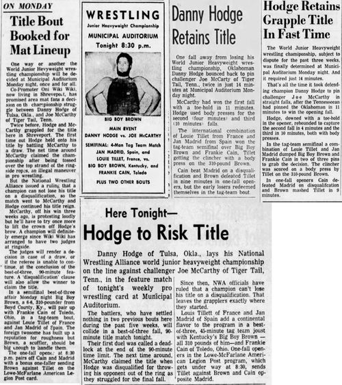 Tiny Smith – Big Boy Brown – Jesse James def Louie Tillet – Jan Madrid – Joe McCarthy [2 out of 3 Falls Match]