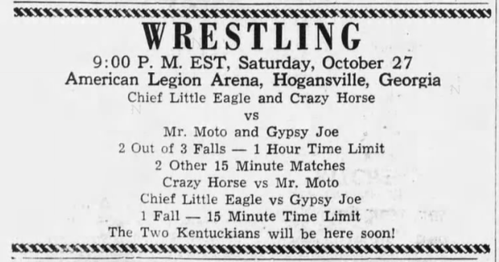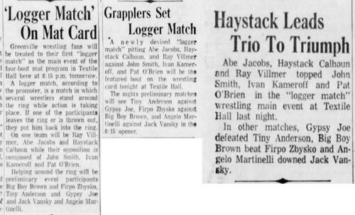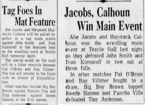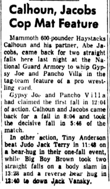 Haystacks Calhoun – Abe Jacobs def Gypsy Joe – Pancho Villa