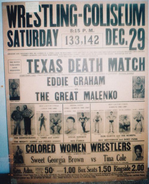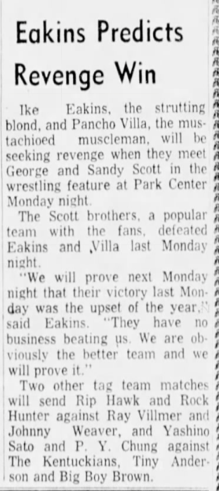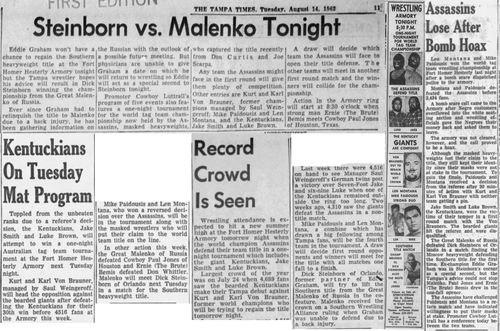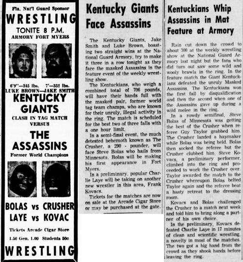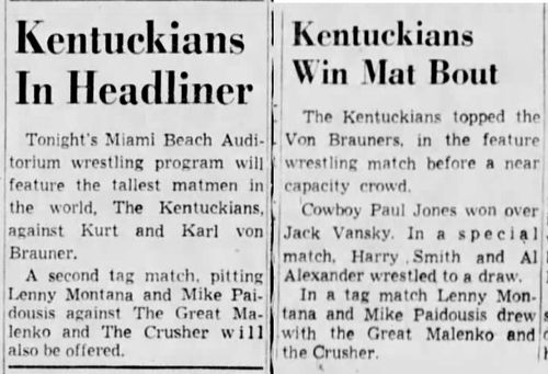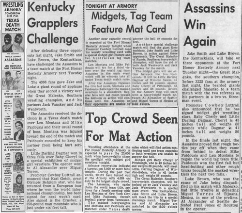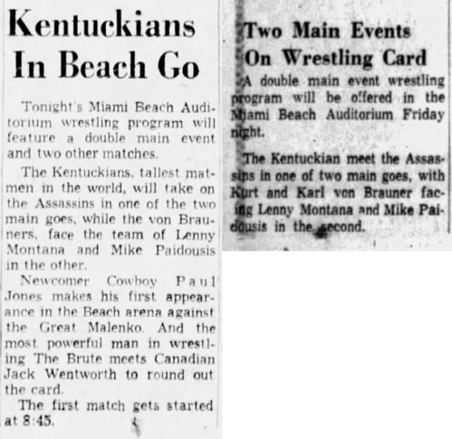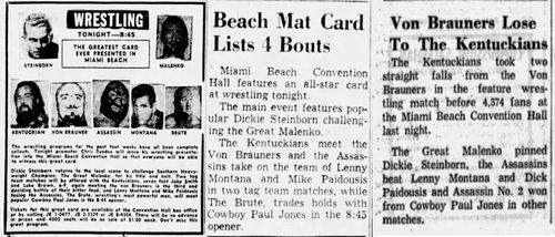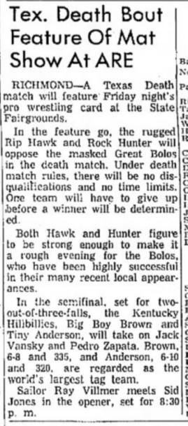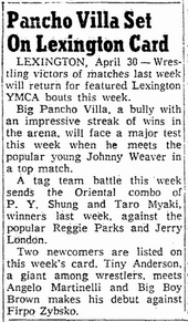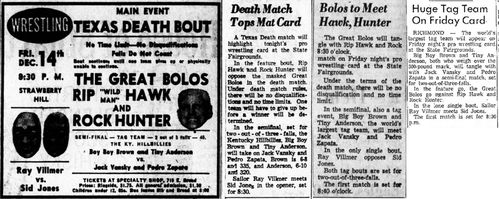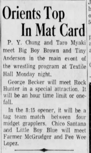“The main event, a tag team match between Puerto Rican stars Miguel Perez and Pete Sanchez and a villanous (sic) Karl von Hess teamed with a despicable Man Mountain Campbell, was won by the spectators.