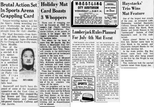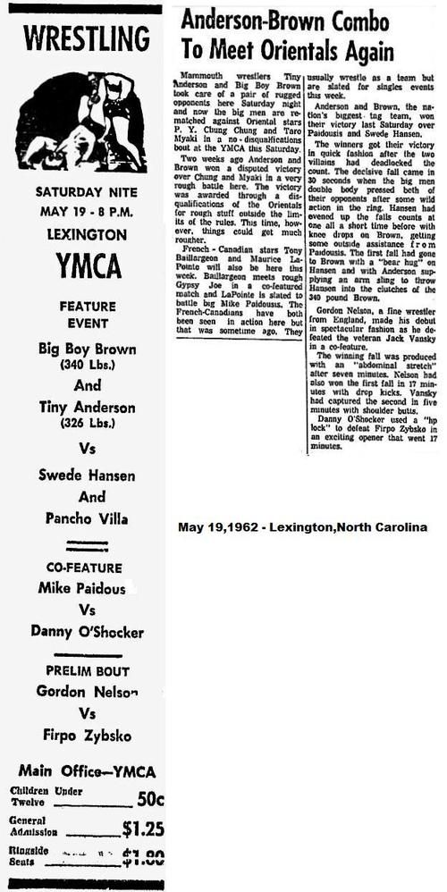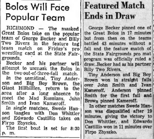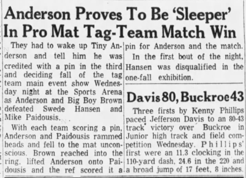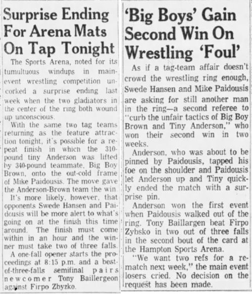 Big Boy Brown – Tiny Anderson def Swede Hanson – Mike Paidousis [2 out of 3 Falls]