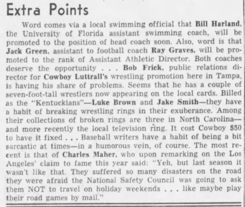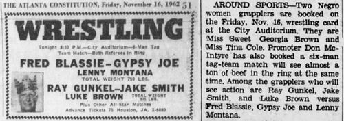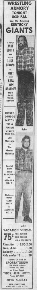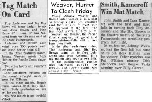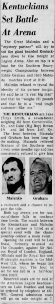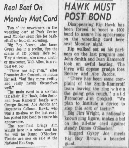 Smith and his pal were disqualified in their heated event with Tiny Anderson and Big Boy Brown when an angry Smith grabbed a chain he had brought to ringside and bashed in Brown’s forehead. Blood flowed like a broken faucet.