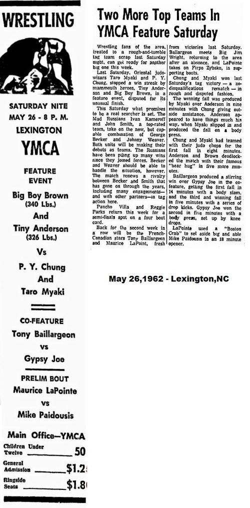 Tiny Anderson – Big Boy Brown def P.Y. Chung – Taro Miyaki [2 out of 3 Falls]
