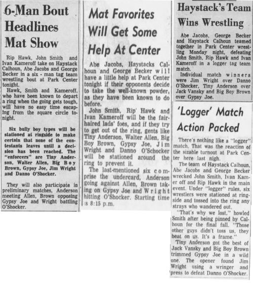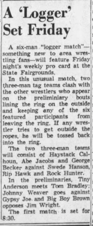 Big Boy Brown – Tiny Anderson – Haystacks Calhoun def. John Smith – Ivan Kameroff – Swede Hanson (Lumberjack Match)