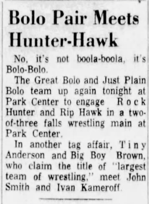 “A new name was placed on the heads of Ivan Kameroff and John Smith after wrestling action at Park Center last night, they’re now known as “the chain gang.”