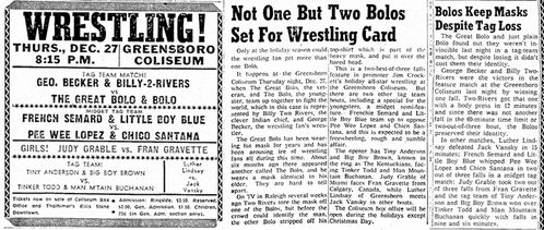 “Renesto and Hamilton, as The Bolos, set a number of attendance records in the Carolinas-Virginia area during the early ’60s. Six-man matches with The Missouri Mauler against The Kentuckians and Haystacks Calhoun established attendance records in such venues as the Charlotte Coliseum, Dorton Arena in Raleigh and the Greenville Memorial Auditorium. Renesto and Hamilton also set attendance marks throughout the territory for tag-team matches against The Kentuckians and Johnny Weaver and Haystacks Calhoun. Those attendance records are still unbroken at the Charlotte Coliseum and Dorton Arena.”