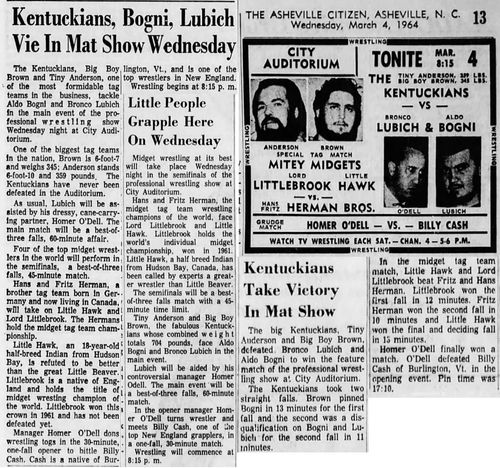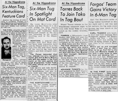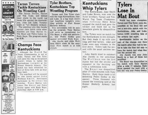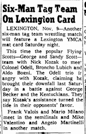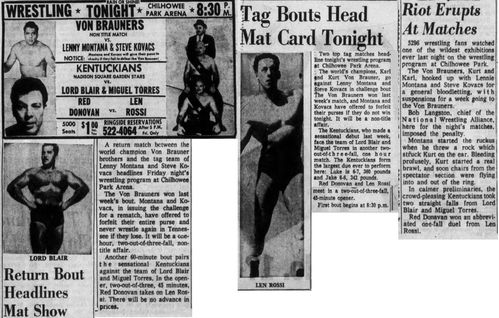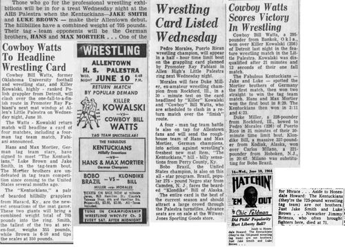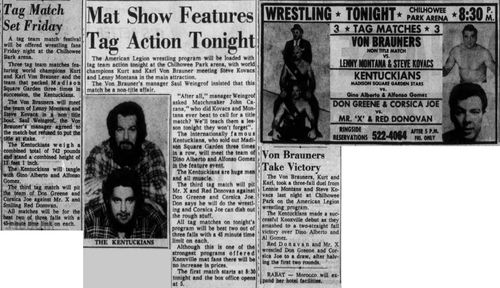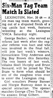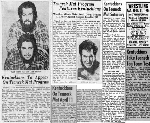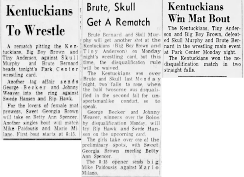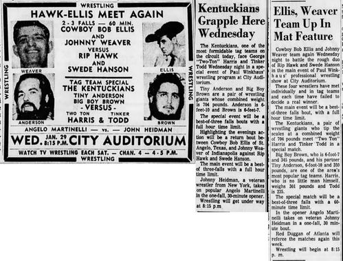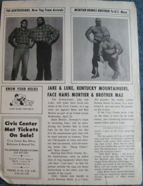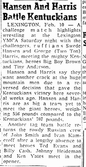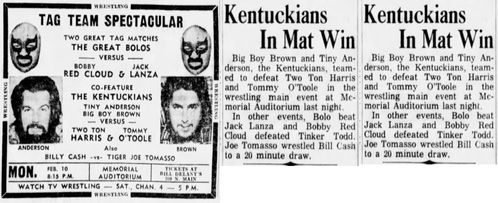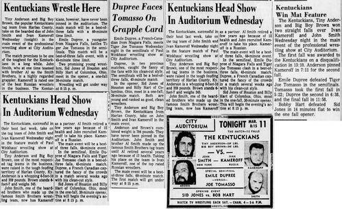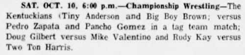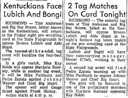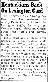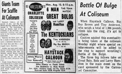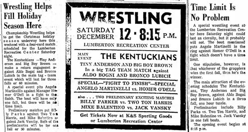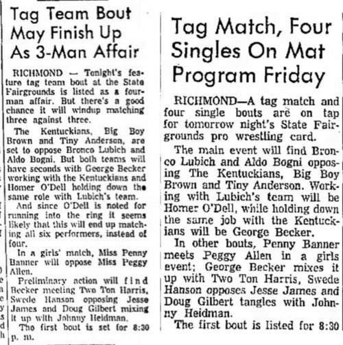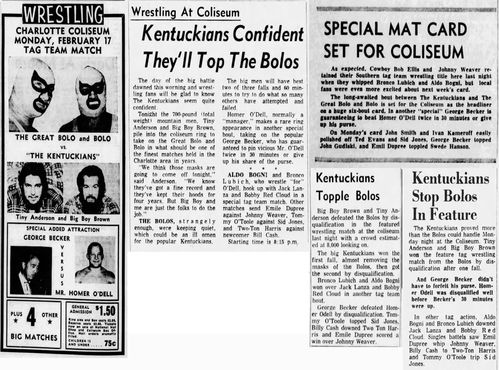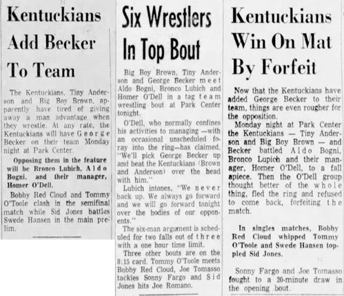 The Kentuckians: Tiny Anderson – Luke “Big Boy” Brown NC Bronco Lubich – Aldo Bogni – Homer O’Dell – Handicap Match