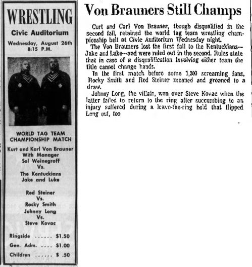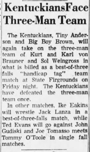 The Kentuckians: Tiny Anderson – Luke “Big Boy” Brown def. Kurt – Karl Von Brauner – Saul Weingeroff – Handicap Match