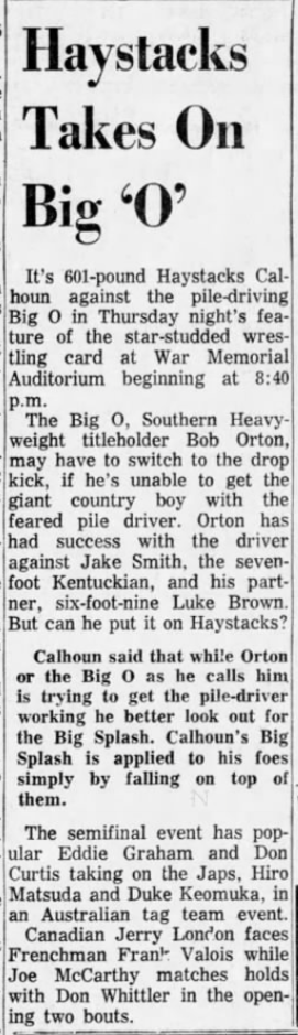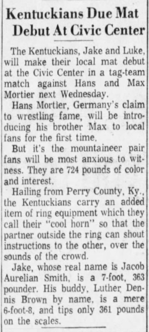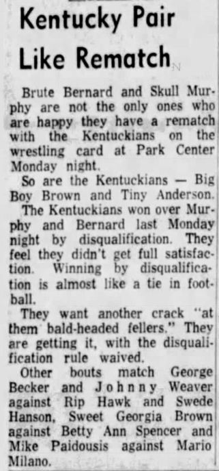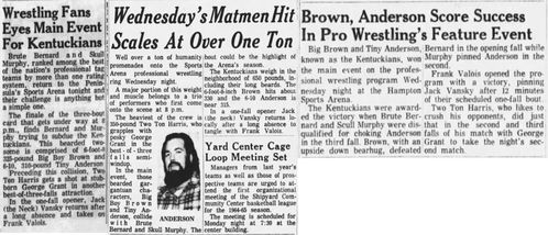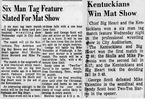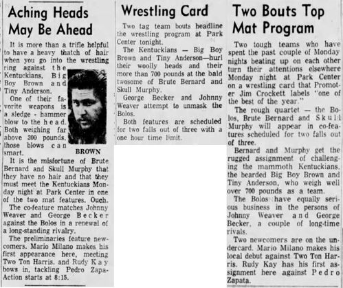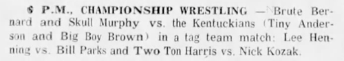 The Kentuckians: Tiny Anderson – Luke “Big Boy” Brown – Haystacks Calhoun def Brute Bernard – Skull Murphy – Bob Orton