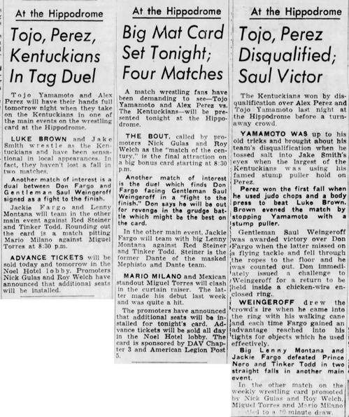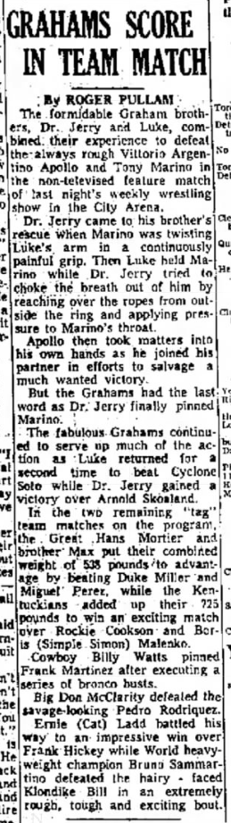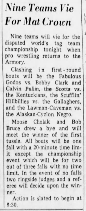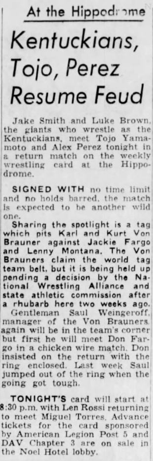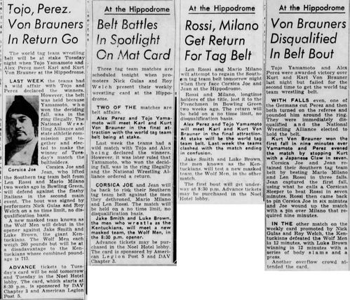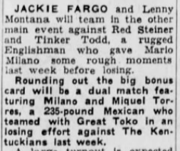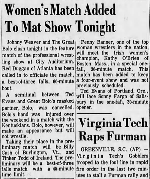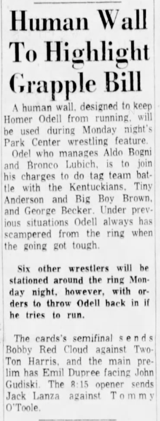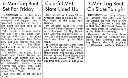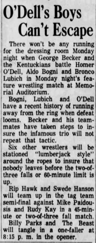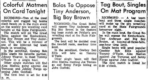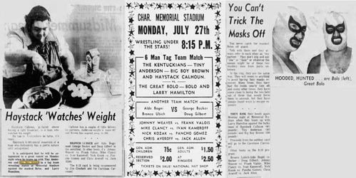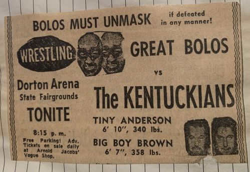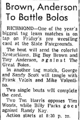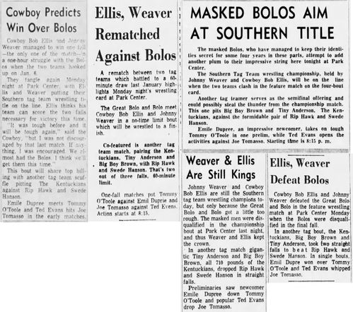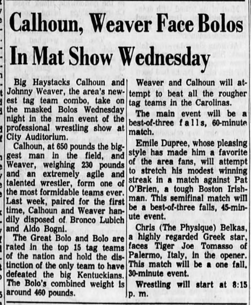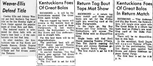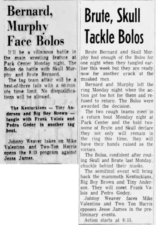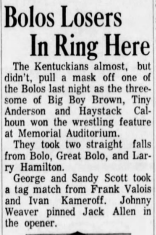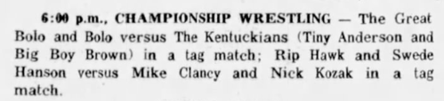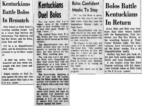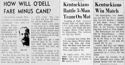 “A semifinal between Ted Evans and Great Bolo’s masked partner, Bolo, was cancelled. Bolo’s hand was injured over the weekend in a match with the Kentuckians. Bolo, however, will make an appearance but will not wrestle.”