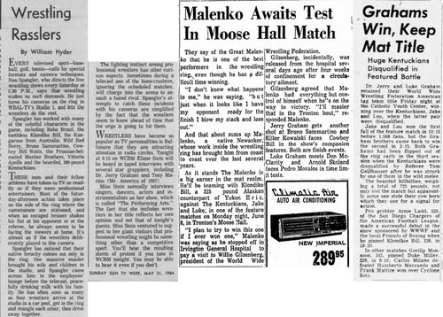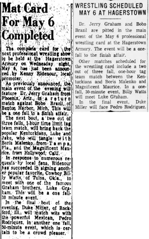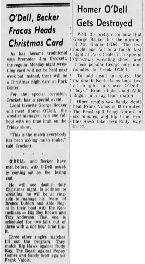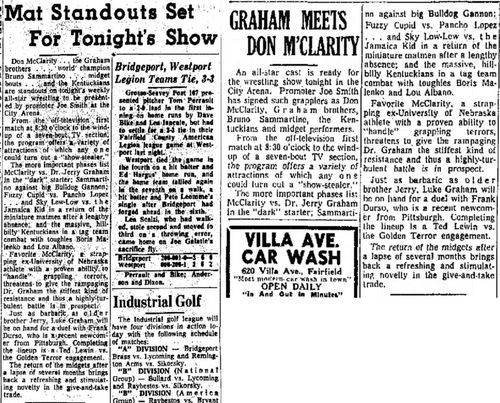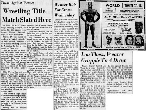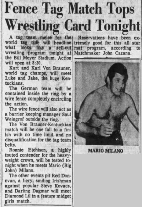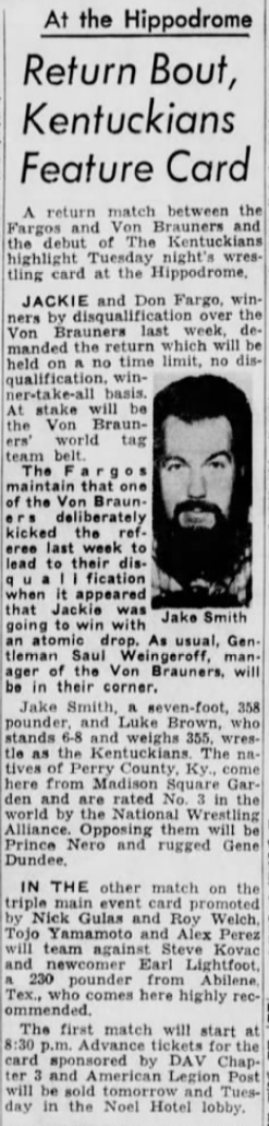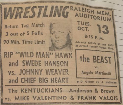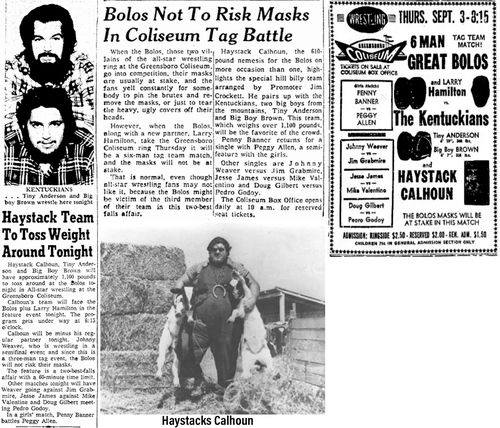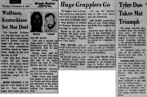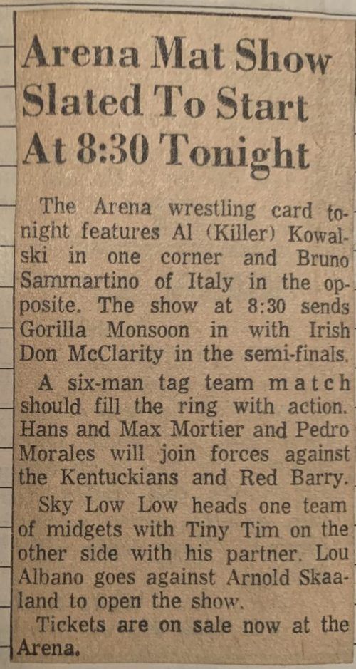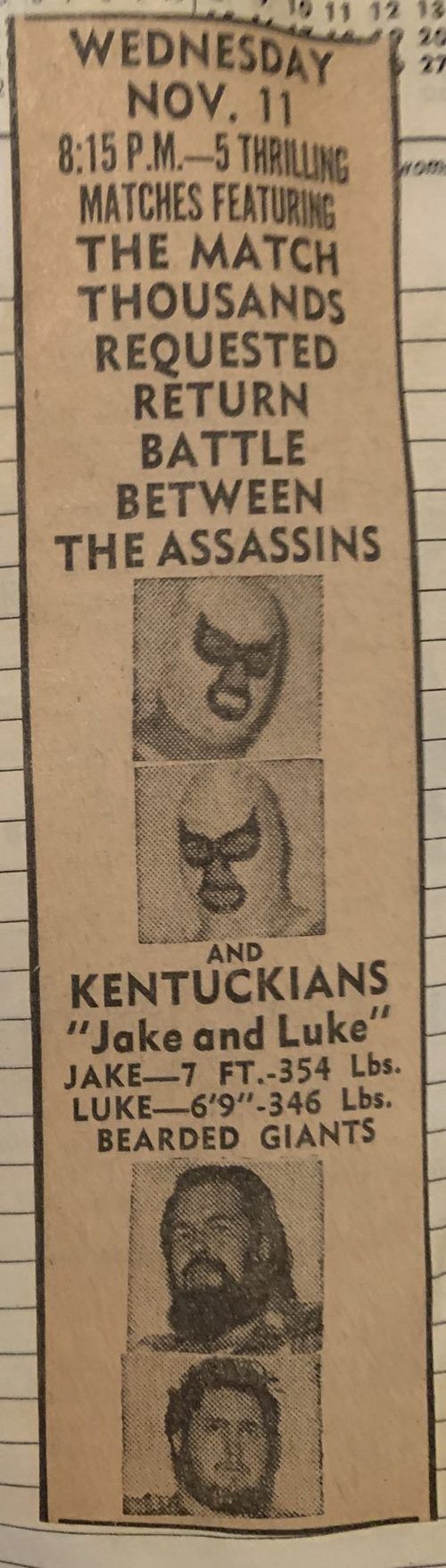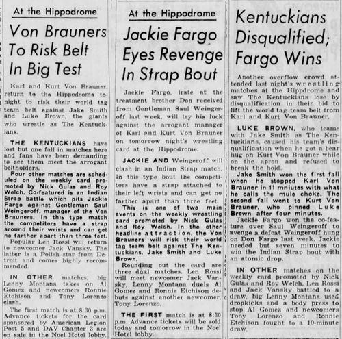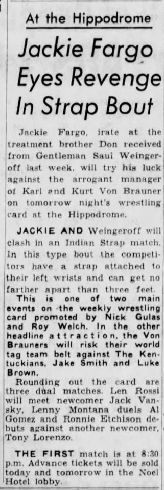 “A semifinal between Ted Evans and Great Bolo’s masked partner, Bolo, was cancelled. Bolo’s hand was injured over the weekend in a match with the Kentuckians. Bolo, however, will make an appearance but will not wrestle.”