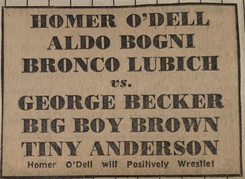 The Kentuckians: Tiny Anderson – Luke “Big Boy” Brown def. Aldo Bogni – Bronco Lubich – Homer O’Dell – Handicap Match
