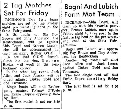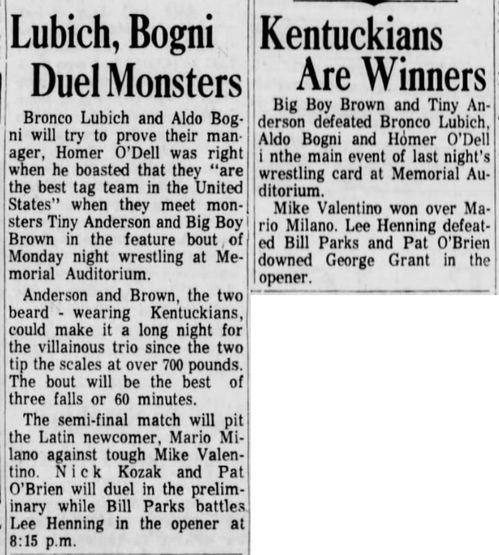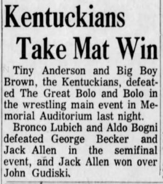 The Kentuckians: Tiny Anderson – Luke “Big Boy” Brown def Aldo Bogni – Bronco Lubich