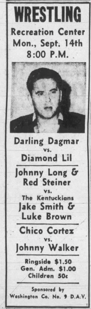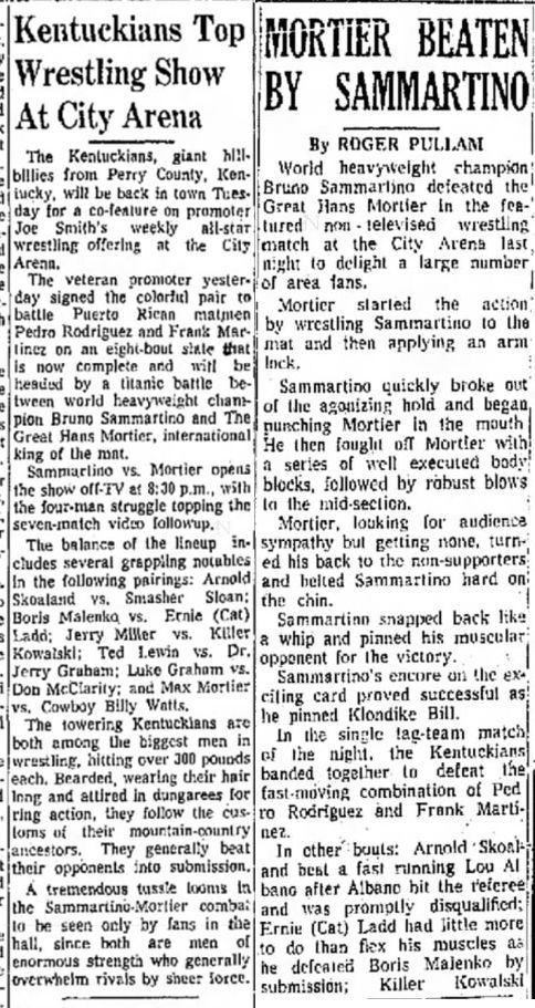 George Becker – The Kentuckians: Tiny Anderson – Luke “Big Boy” Brown def. Aldo Bogni – Bronco Lubich – Homer O’Dell