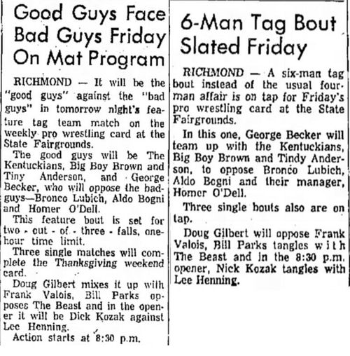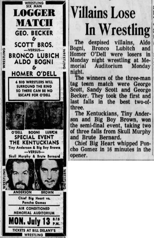 George Becker – The Kentuckians: Tiny Anderson – Luke “Big Boy” Brown def Aldo Bogni – Bronco Lubich – Homer O’Dell