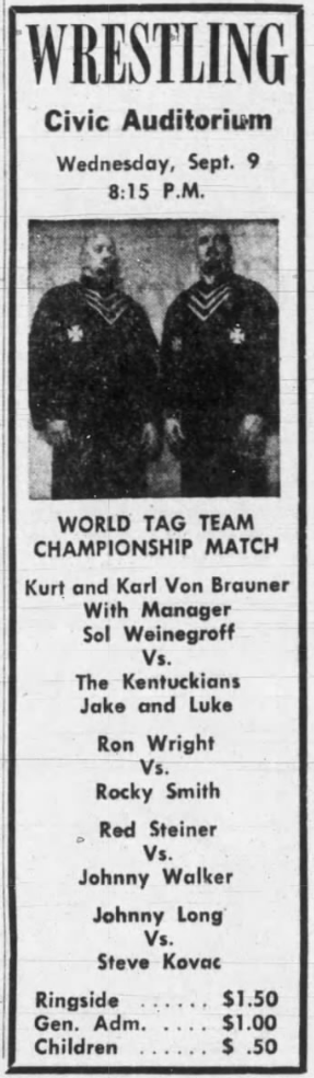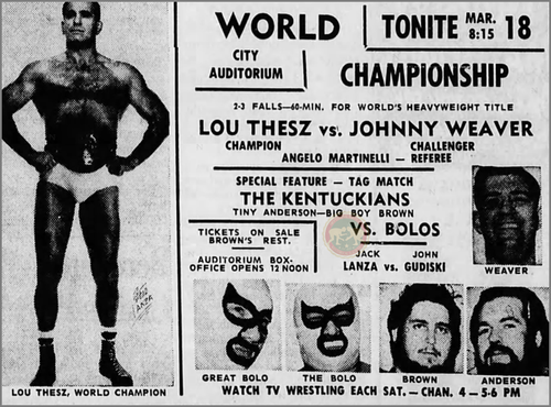 Aldo Bogni – Bronco Lubich def Bob Ellis – Johnny Weaver