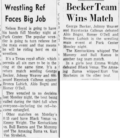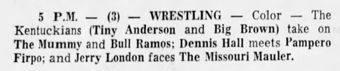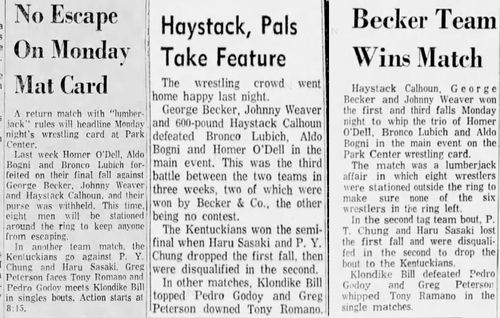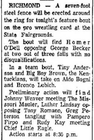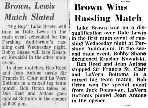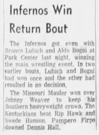 (Bob Orton Sr., who risked leaving town, beat Kentuckian Luke Brown who had to shave his head in Omaha. NE.)