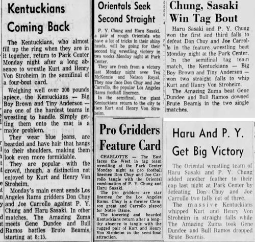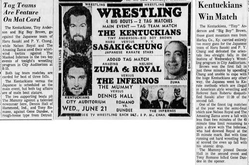 Hiro Matsuda – Antonio Inoki – Masao Kimura def The Kentuckians: Tiny Anderson – Luke “Big Boy” Brown – Danny Hodge