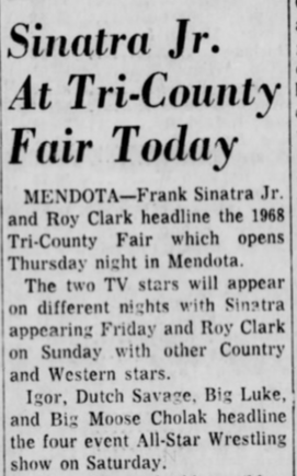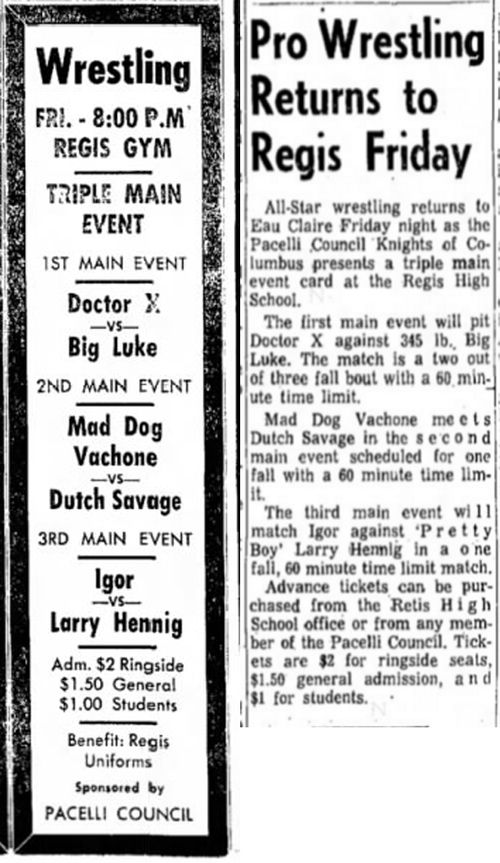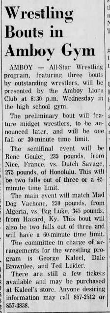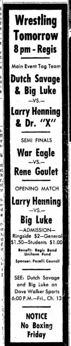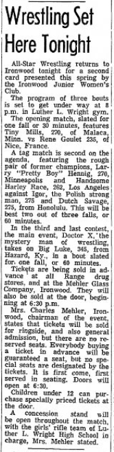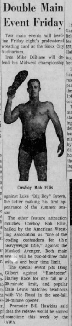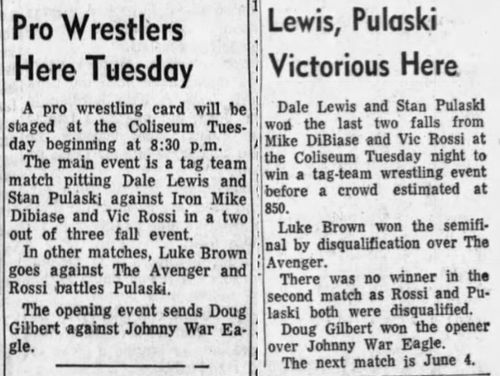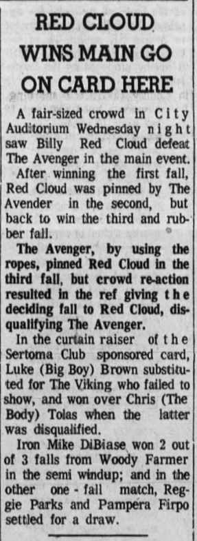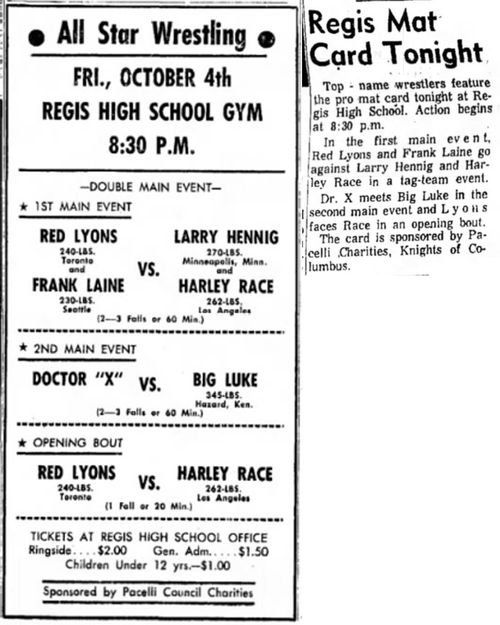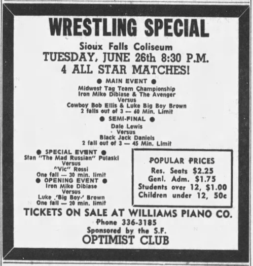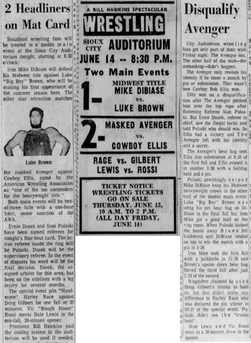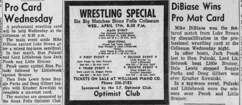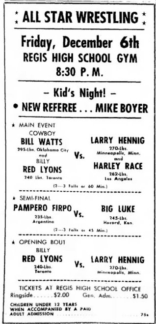 Larry Hennig – Lars Anderson def Billy Red Lyons – Cowboy Frankie Laine