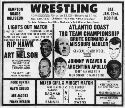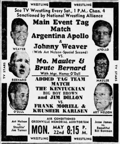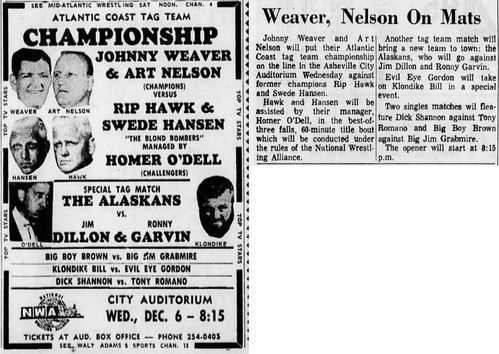 Johnny Weaver – Argentine Apollo def Rip Hawk – Swede Hanson