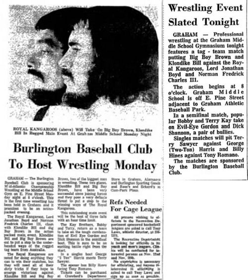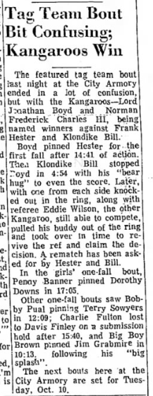 The Royal Kangaroos – Lord Jonathan Boyd – Norman Frederick Charles III def. Big Boy Brown -Klondike Bill