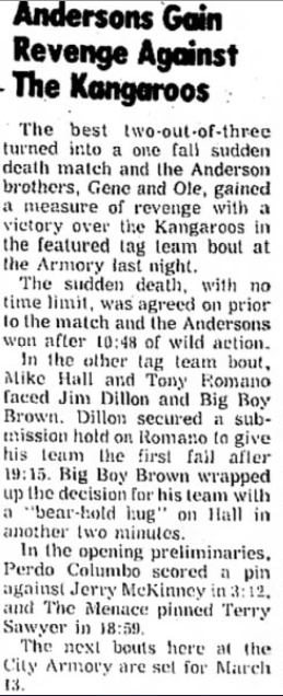Jerry Brisco – Johnny Weaver – Thunderbolt Patterson def Rip Hawk – Killer Karl Kox – Homer O’Dell