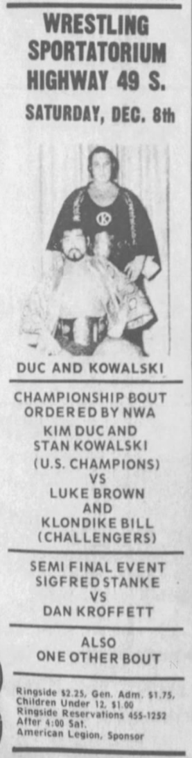 November 17, 1973 -Greenwood, MS – Sportatorium – NWA Tag Team Championship Match