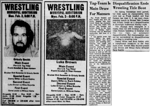 Bob Sweetan – Grizzly Smith vs. Stan Hansen – Frank Goodish