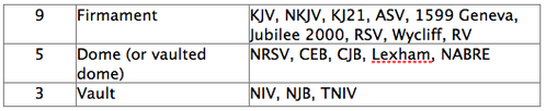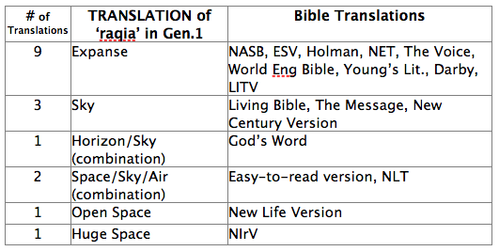 The first problem with Dr. Avalos’ argument is that his definition of ‘raqia’ is too narrow. With his knowledge of the Hebrew language, he is well aware but fails to inform us that the word is translated quite differently by many expert linguists. As a matter of fact, the major Hebrew lexicons and Hebrew dictionaries ALL provide a definition that includes “expanse” as well as “firmament.” Herein lies the problem, which word more closely reflects the meaning as it was intended by the original author and as it was understood by the original audience? OBVIOUSLY the words firmament and expanse have quite different meanings in our modern day English. The translation problem is obvious when one compares translations. The KJV translates ‘raqia’ as firmament all 17 times the word appears in the Old Testament, while the NASB translates it as expanse all 17 times. The word ‘raqia’ appears nine (9) times in Genesis 1 and a survey of 40 different translations shows how divided translators are regarding the word just in Genesis 1:6-8, 14-15, 17 and 20.
