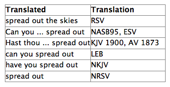 Prior to concluding this response, we still need to deal with two other supporting arguments presented by Dr. Avalos. First, does the passage in Job 37:18 teach that the sky is a solid dome? Let’s look at it again, “Can you, like him, hammer out the skies, hard as a molten mirror?” (RSV). Let us begin by establishing that Elihu is speaking and not God. Not only have Job’s friends been wrong about the cause of Job’s affliction, but God himself rejects their entire argument just a few verses later, “Who is this that darkens counsel by words without knowledge?” (Job 38:2 NASB). Also, notice that Dr. Avalos mistakenly quotes the RSV as using the verb “hammer out” which it does not do. Notice how the verb ‘raqa’ is translated across the various translations: