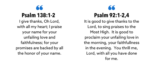 As believers, we know that gratefulness is something we should be practicing 24/7, not just the fourth Thursday of November each year. As you read the following verses, my prayer is that you will pause for a moment to offer praise for our Lord’s unfailing love and faithfulness to us.