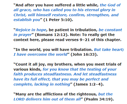 Now, granted, I only shared the negative parts of the above verses to make the point that believers should expect trials. What I didn’t show was the positive results of those trials and how God uses them to make us more like Him. Here’s the whole message of these verses (color and italics used for emphasis) to tell the “rest of the story”:
