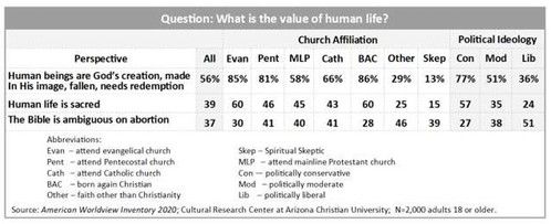 In the 2022 worldview study, over one-third of pastors surveyed said they did not believe human life is sacred. Almost one-in-three evangelicals also say the Bible is ambiguous on abortion.