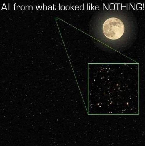 Some time ago, a Facebook friend posted a progression of twenty-eight slides that provided perspective on the universe’s vastness. One of the slides showed a very small black area in the night sky, a tenth of the size of our moon, that had been a focal point for the Hubble telescope for four months in 2003 (see below). What the Hubble revealed were an infinite number of illuminated dots, each representing an entire galaxy.