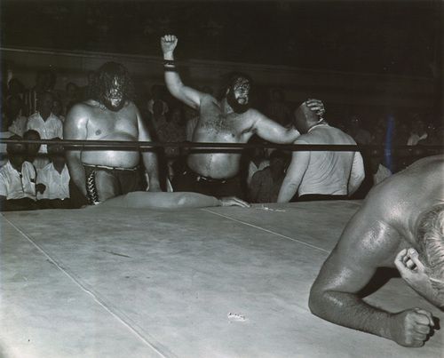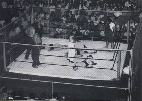 The masked wrestlers are The Assasins or Bolo’s, depended on where they were wrestling. I’m not sure who the third man in the ring was.