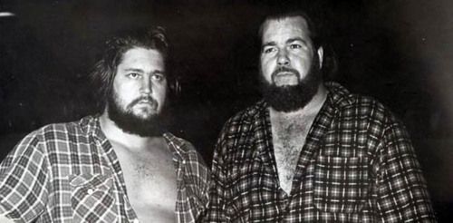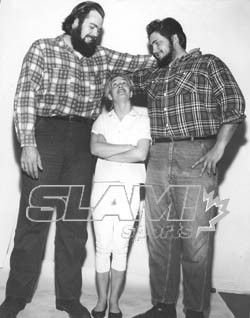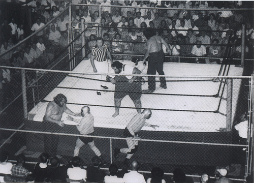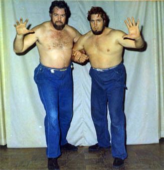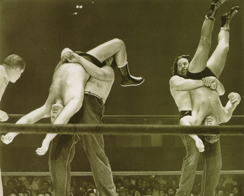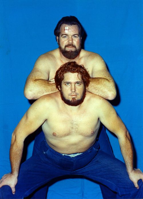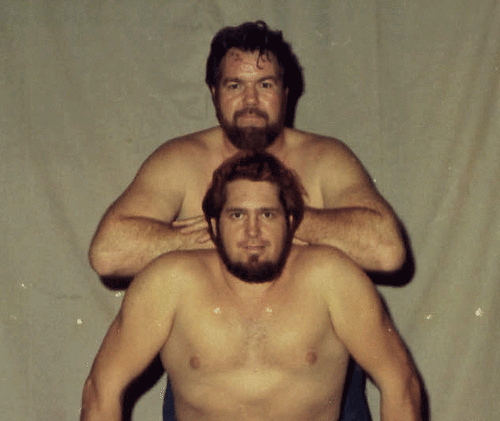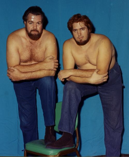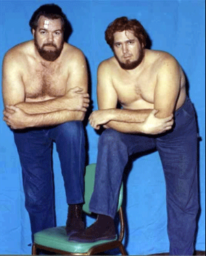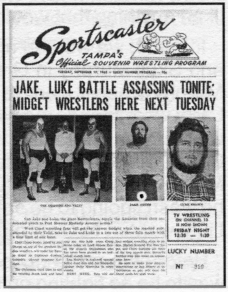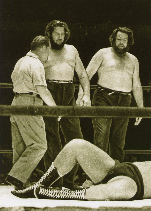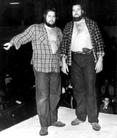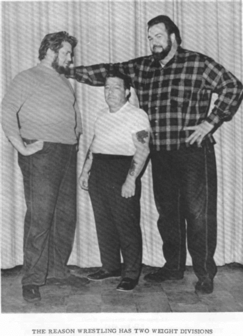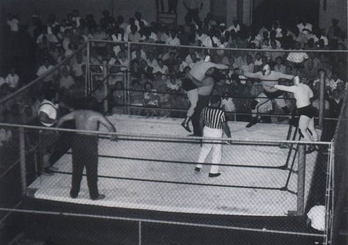 The Kentuckians with Haystacks Calhoun vs. the Assassins. That’s my father giving the ‘bear hug’ to one of the Assassins. Six Man Tag Teams were big for a while.